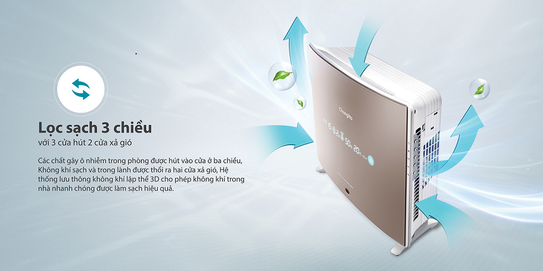 Với chức năng lọc 3 chiều, các chất gây ô nhiễm được hút vào ở 3 chiều và không khí sạch được thổi ra từ 2 cửa xả. Với hệ thống lưu thông không khí lập thể 3D cho phép không khí trong nhà nhanh chóng được làm sạch hiệu quả.
