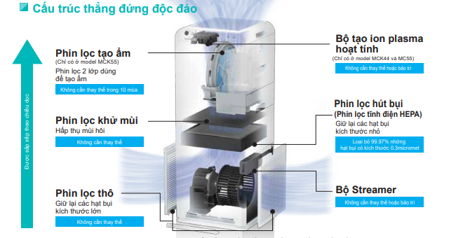 Với thiết kế thẳng đứng, máy lọc không khí và tạo ẩm Daikin MCK55TVM6 có các màng lọc thiết kế nằm ngang và sắp xếp theo chiều dọc giúp máy nâng cao hiệu suất loại bỏ ô nhiễm đáng kể.